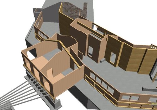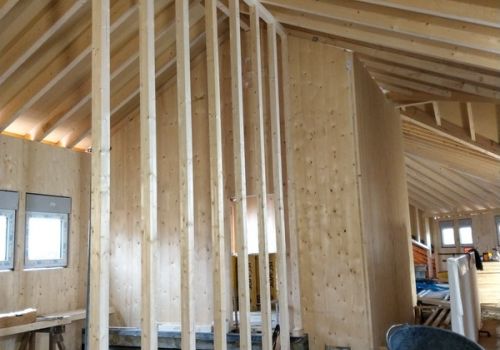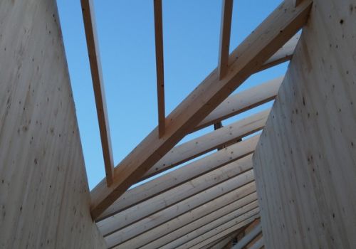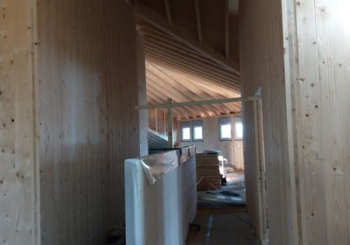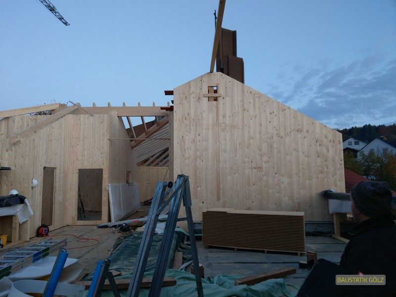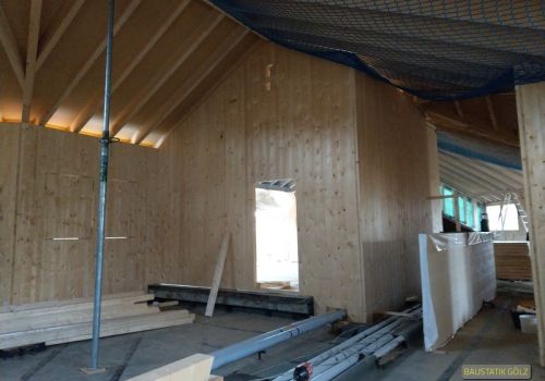 Um das Gewicht zu reduzieren und die Bauzeit zu verkürzen, wurde der Massivbau mit einer Holzkonstruktion nach oben erweitert. Die Wände bestehen aus Brettsperrholz, die Dachkonstruktion konventionell als Pfettendach. Die Aufstockung nimmt gekonnt die Architektur des Bestands auf und erweitert diese nach oben. Wir haben nach einer Analyse des Bestands und dessen Traglastreserven und Auslastung eine optimierte Tragkonstruktion entwickelt.